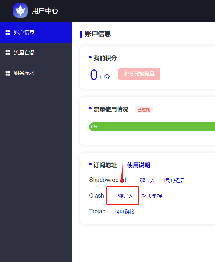 3.安装好软件后,登录极酷用户中心,确保已经购买了流量套餐,在帐户信息页面下,选择下图红色方框内【一键导入】