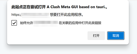5.勾选「始终允许」后点击「打开」,Clash Verge 会提示导入成功。打开 Clash Verge,找到左侧的「订阅」,点击hongxing