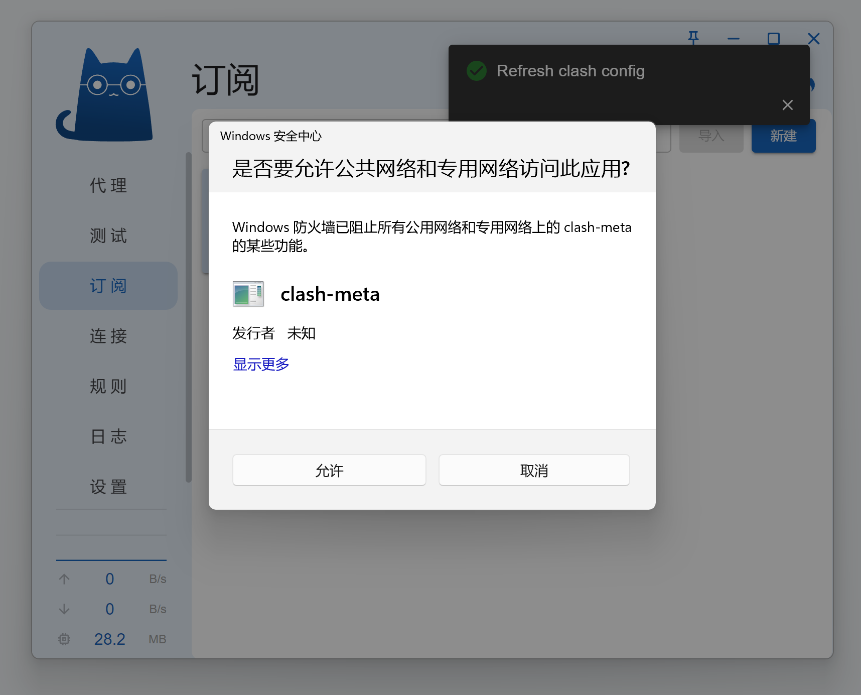 6.Windows 安全中心可能会弹出提示询问你是否允许 Clash-Meta 的网络访问,请选择允许: