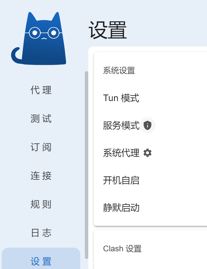 打开 Clash Verge 界面,点击「设置」,然后点击「服务模式」右侧的盾牌图标: